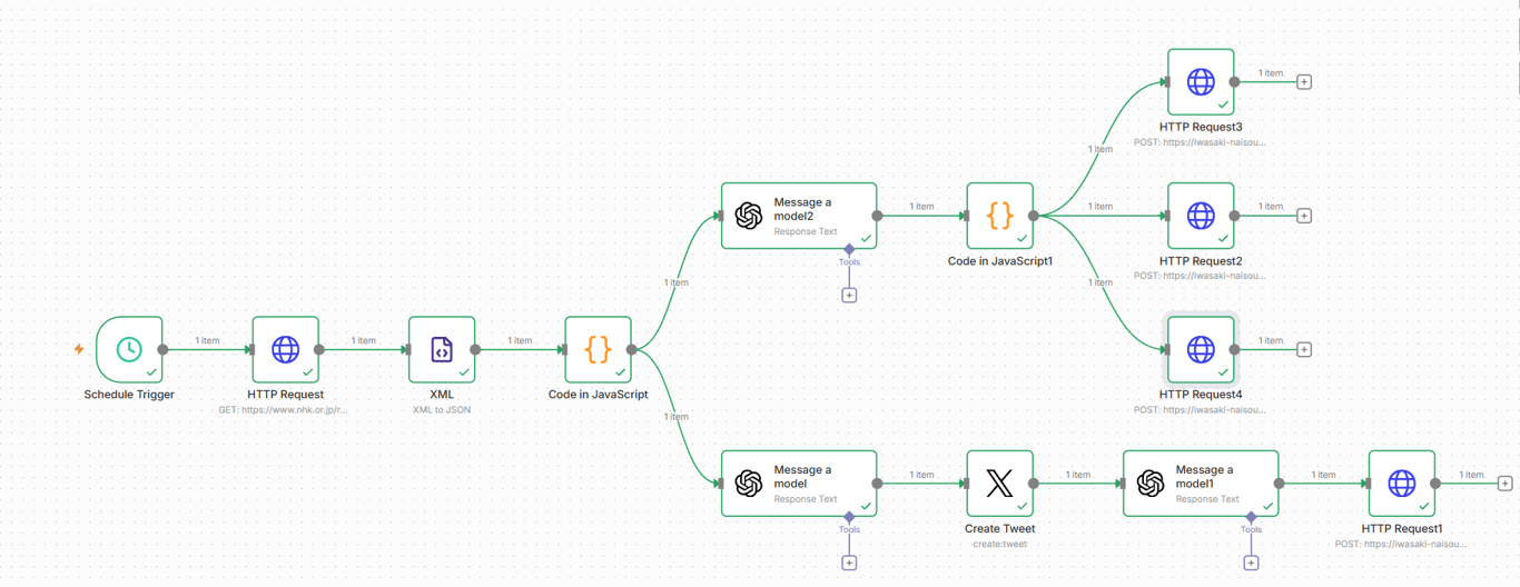 - Schedule Trigger → NHK RSS取得 → XML→JSON変換